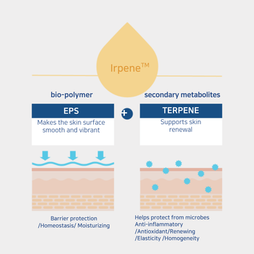 Irpene™ contains polymer components known for their role in cell-barrier protection. This means the ingredient is designed to support and maintain the skin’s natural defense structure.